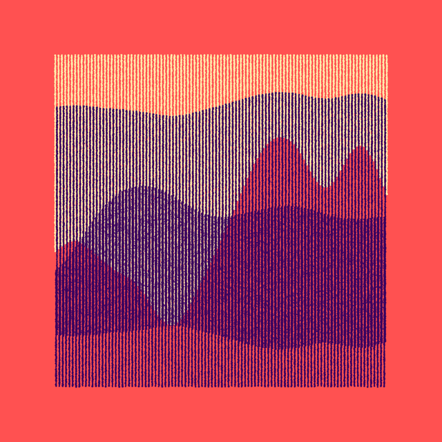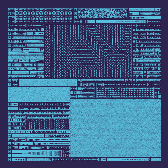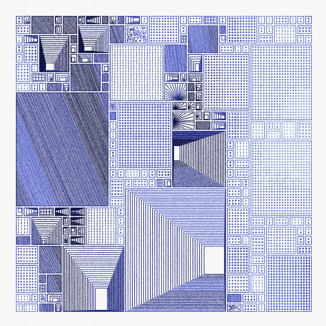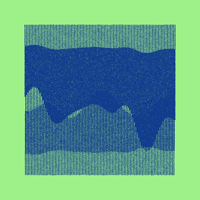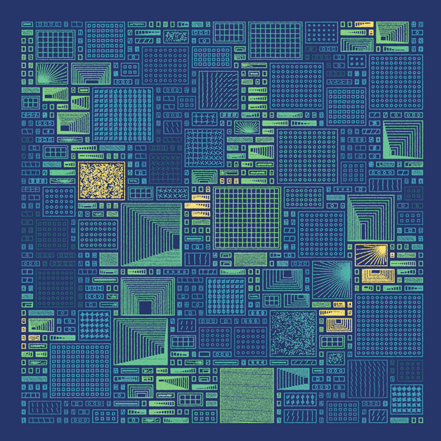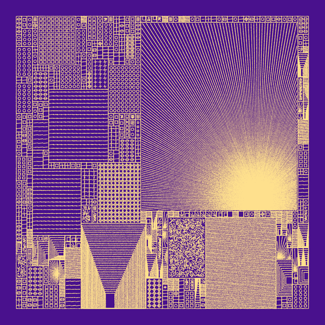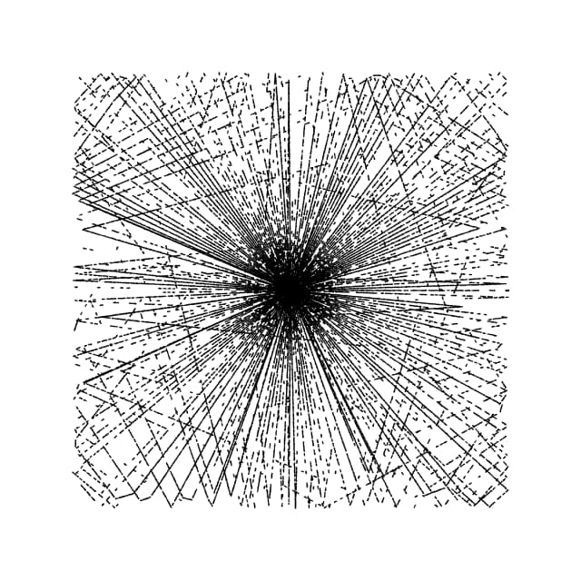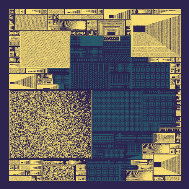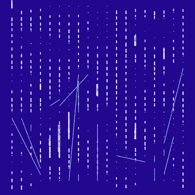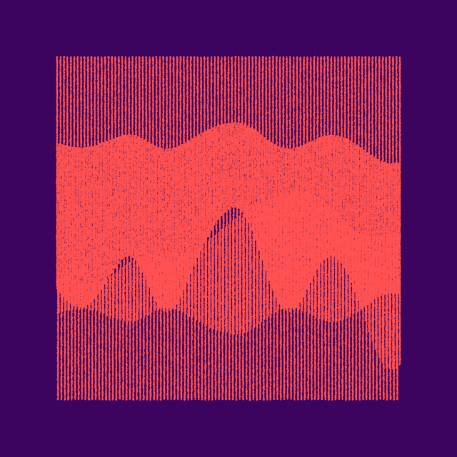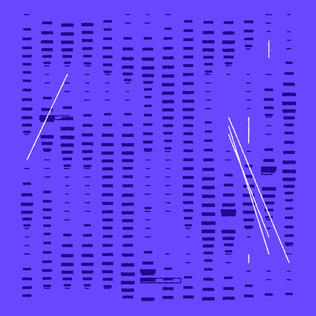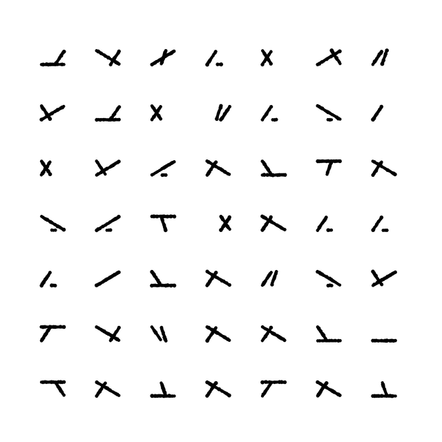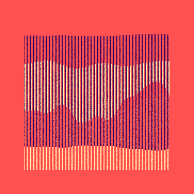 Three parallel sets of lines of modulated length combine to create emergent shapes.