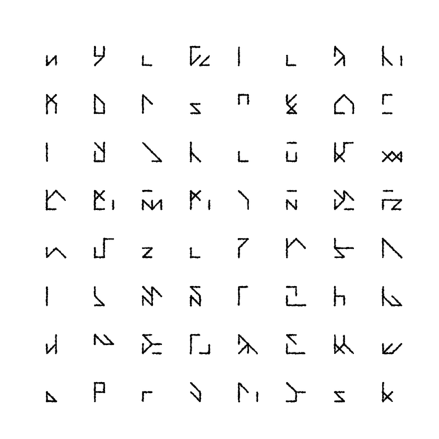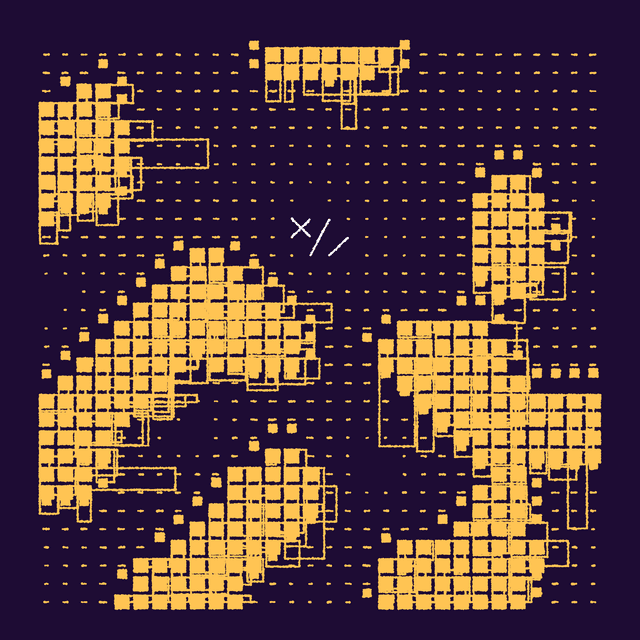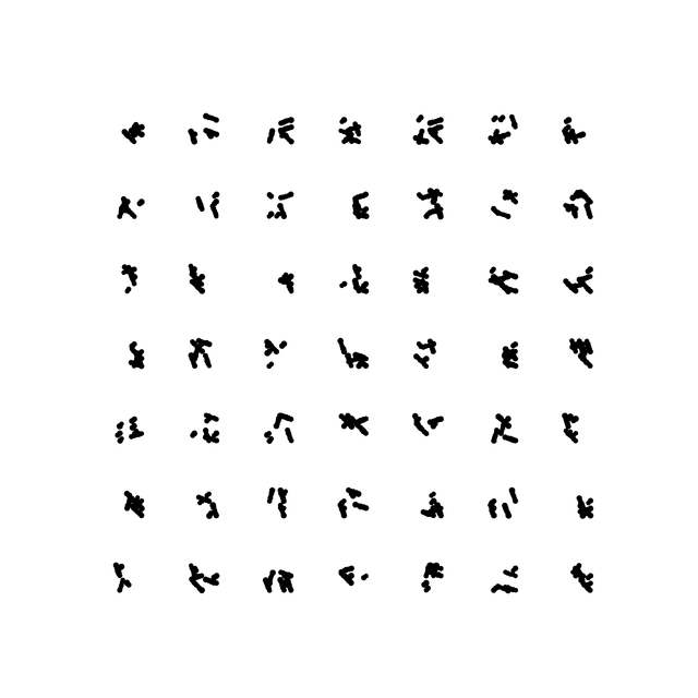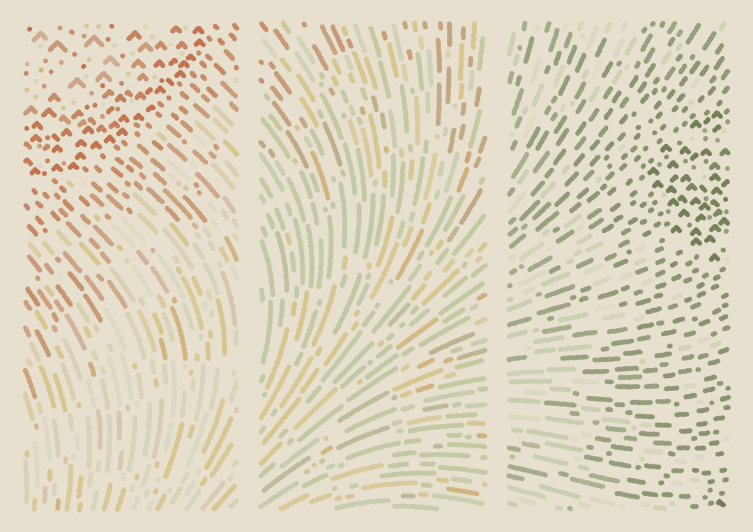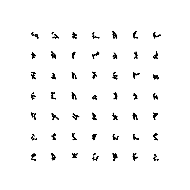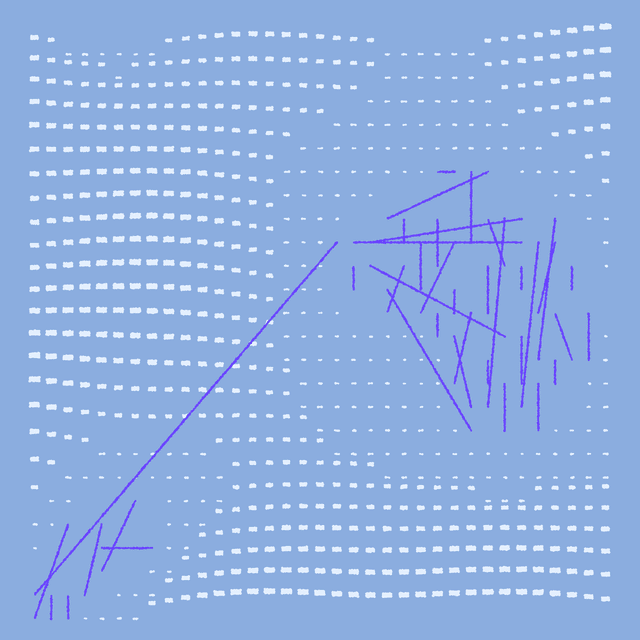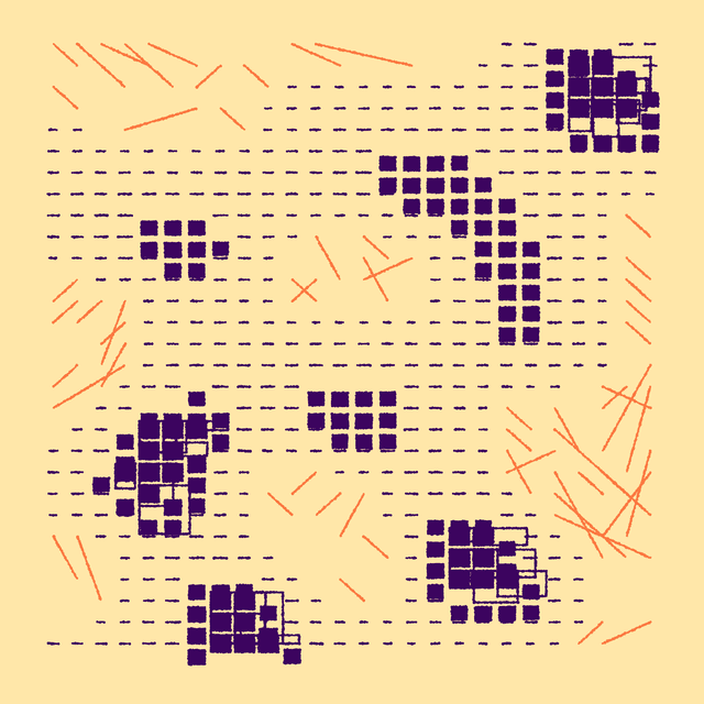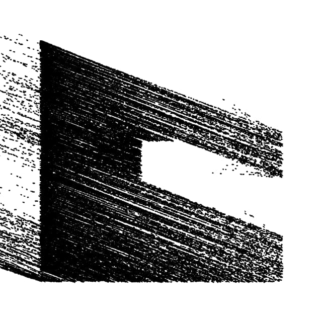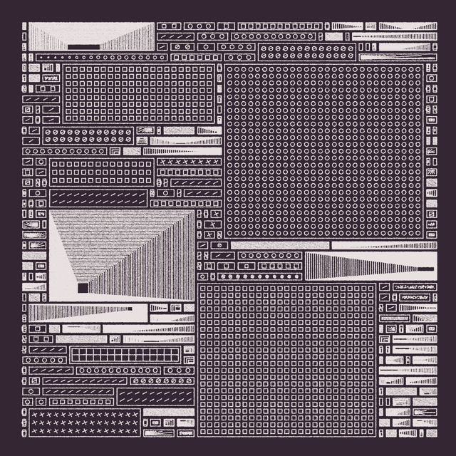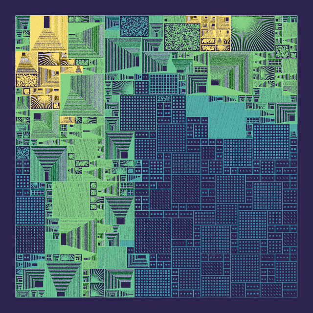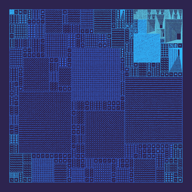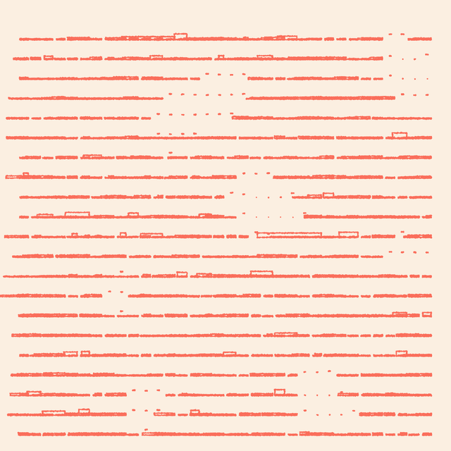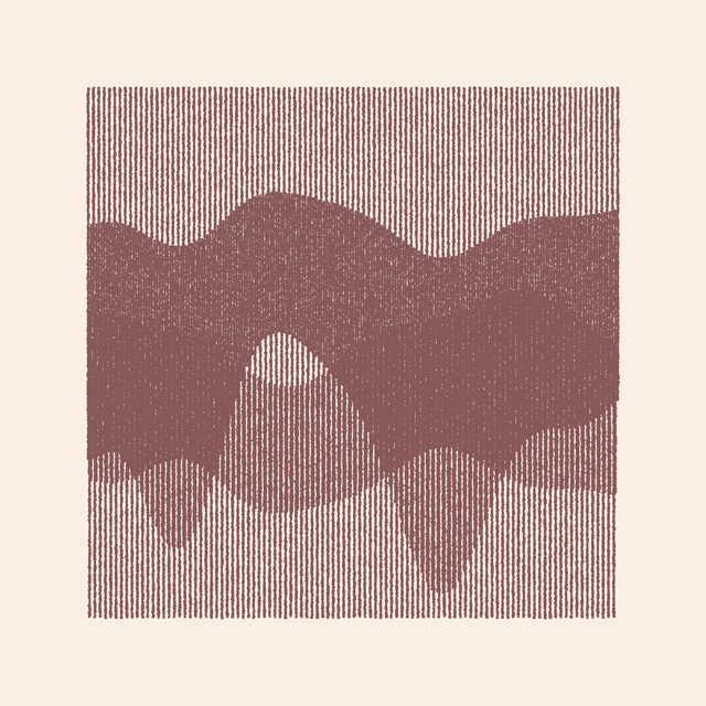 Three parallel sets of lines of modulated length combine to create emergent shapes.