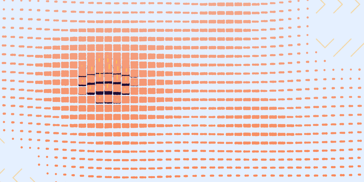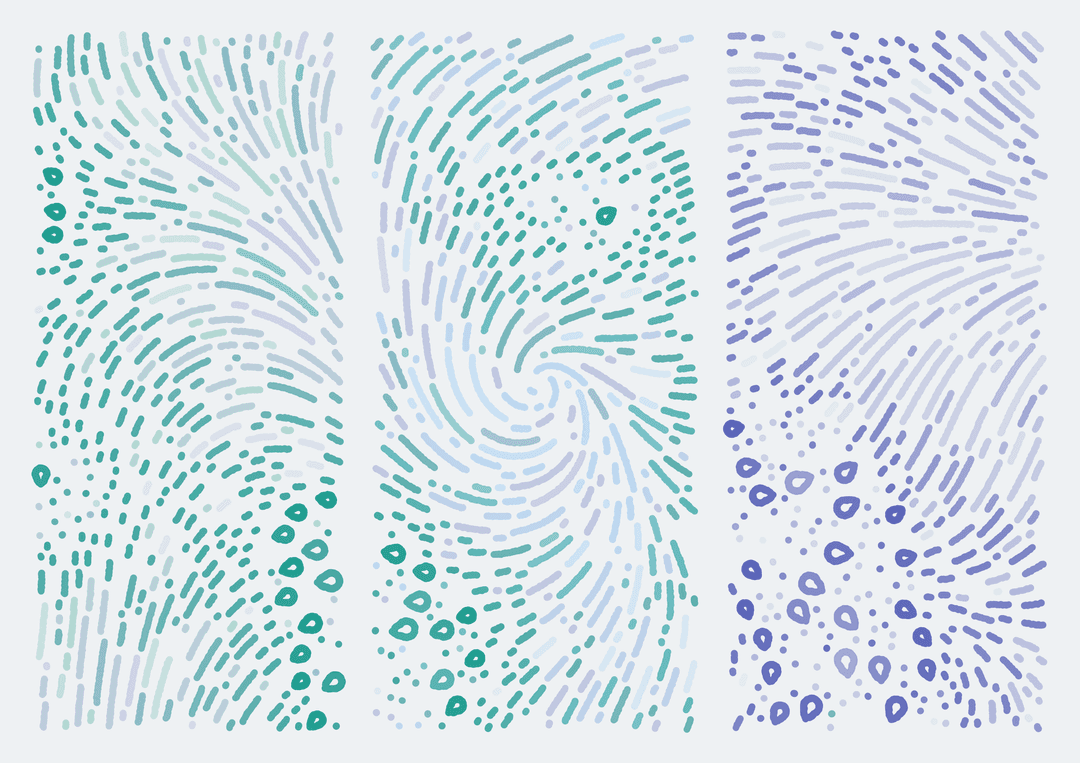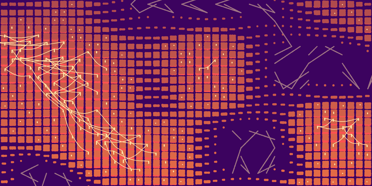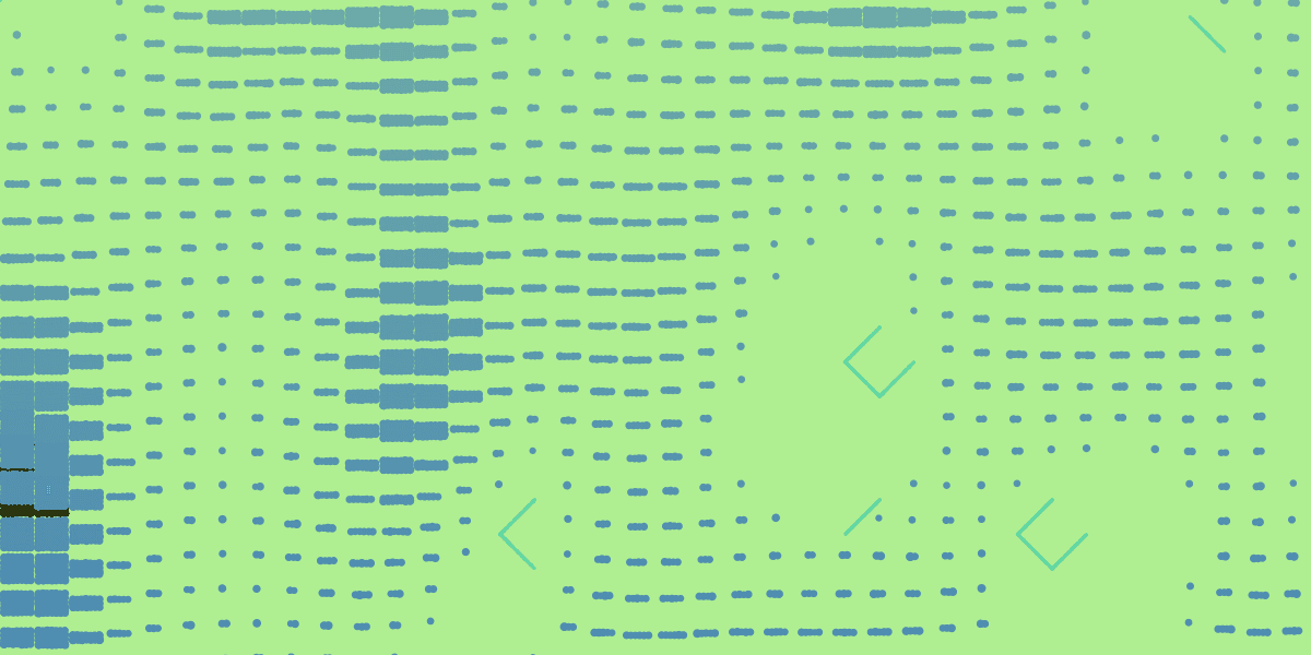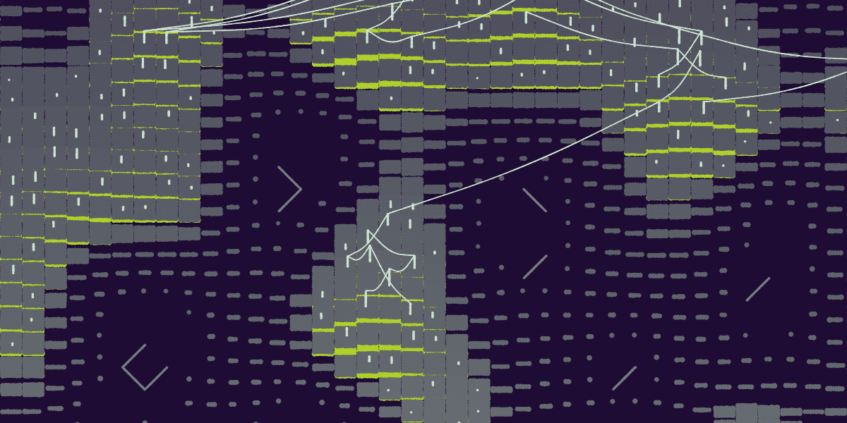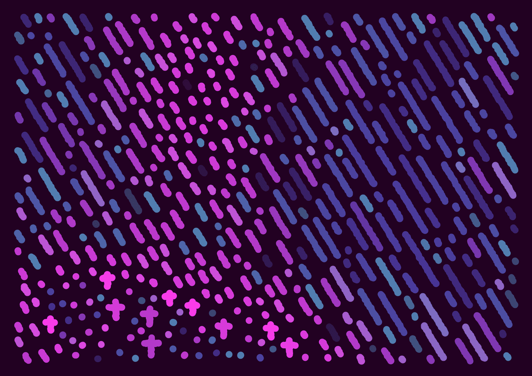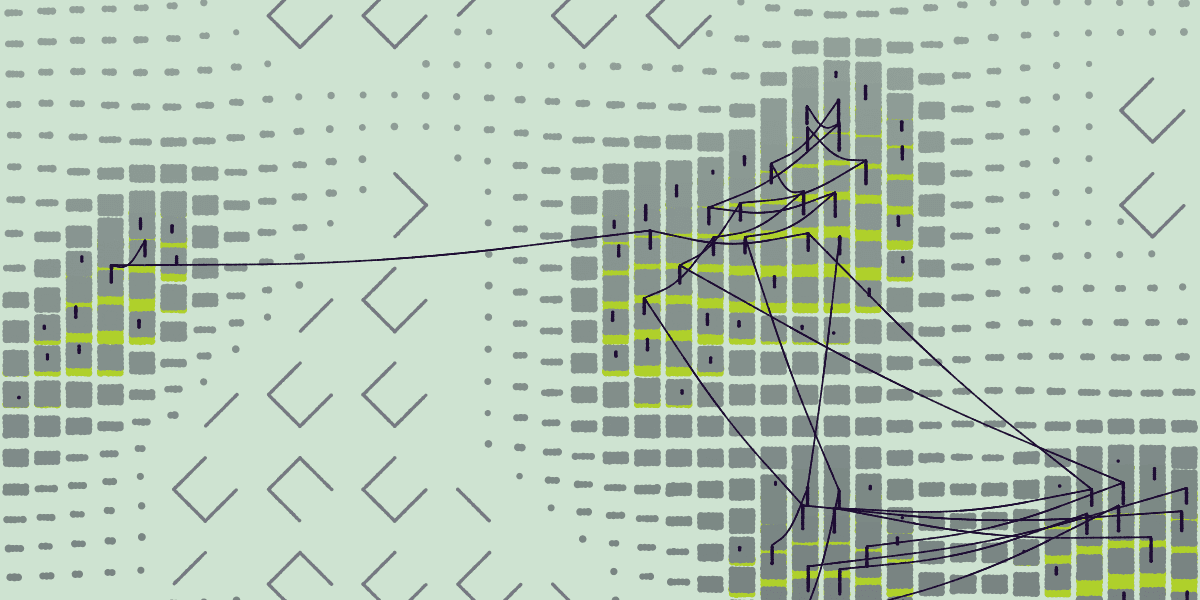 Three parallel sets of lines of modulated length combine to create emergent shapes.